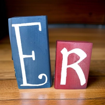- One (1) 4"x7"x2" wood block painted navy with a cream letter "E"