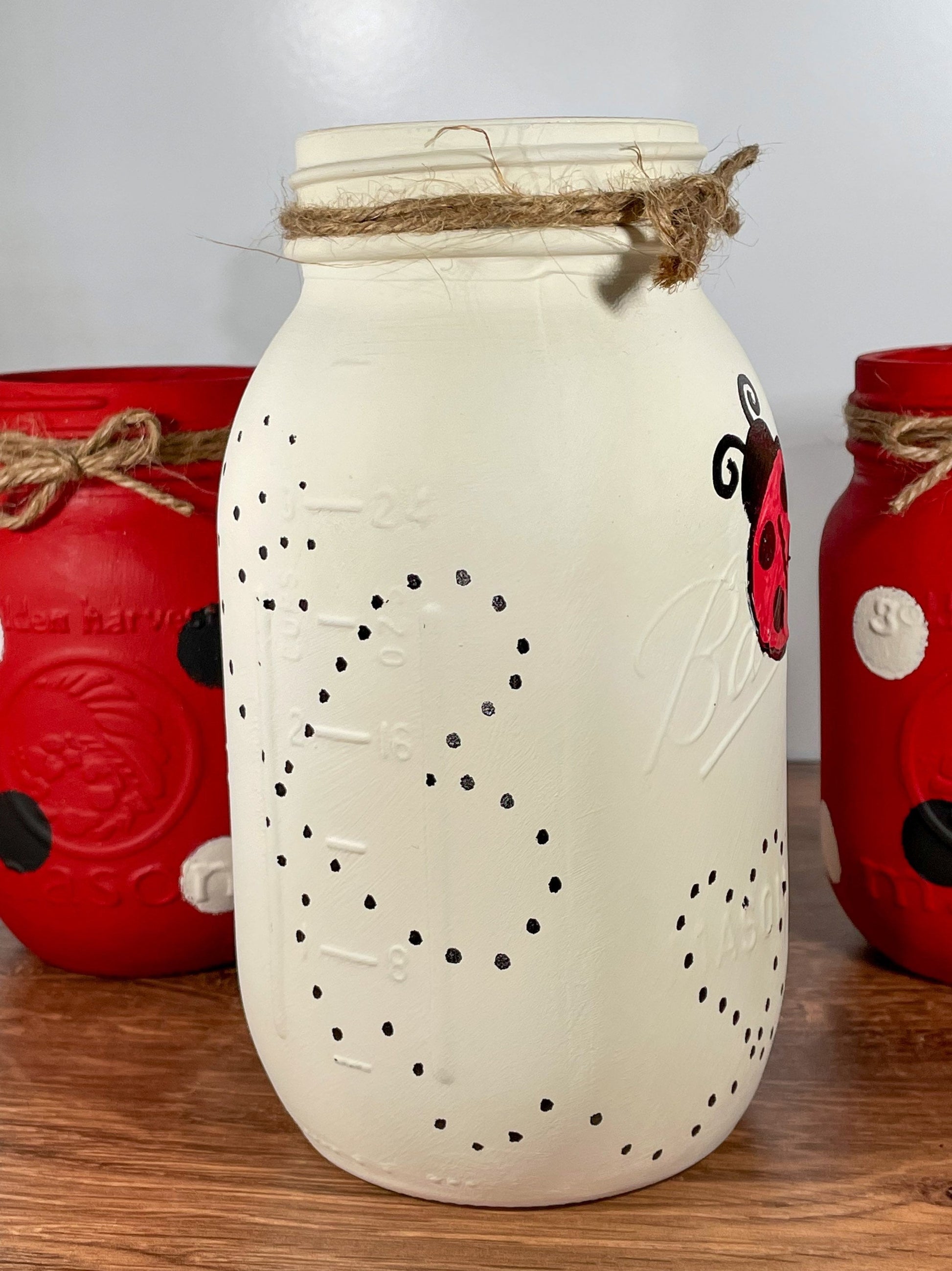 - One (1) regular mouth quart-sized mason jar painted cream with a ladybug and heart trail